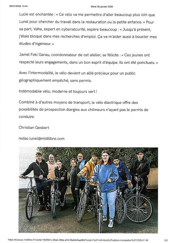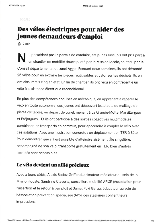Article Midi Libre – Chantier Mobilité Revue de presse 4 février 2026 8 Après un atelier riche en apprentissage avec APS 34 et le gain d’un VAE, Les jeunes de la MLJPCH ont eu droit à leur article dans le Midi-Libre Partager cet article