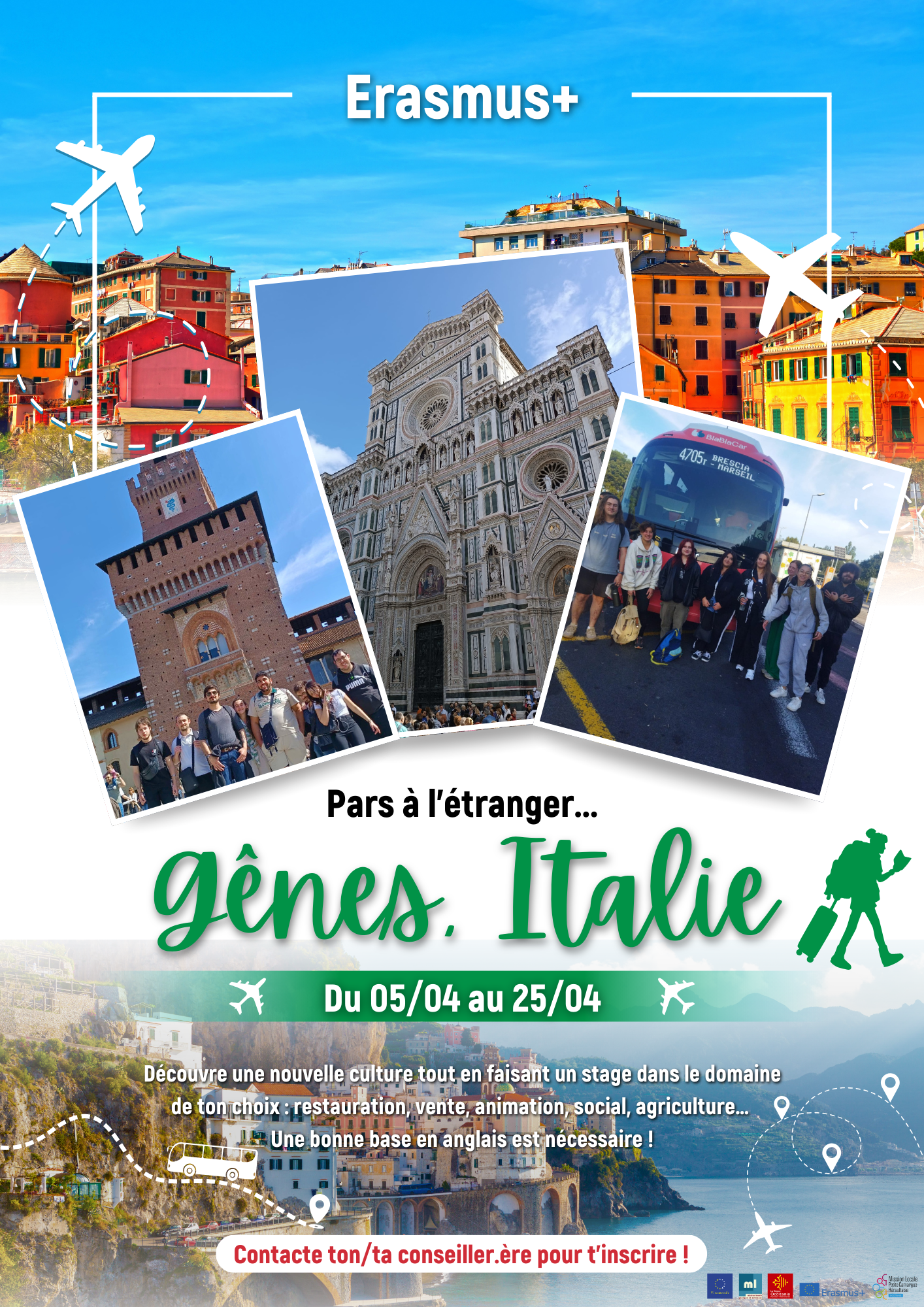 Du 5 avril au 25 avril, la Mission Locale Petite Camargue Héraultaise propose une expérience unique avec le programme Erasmus+ : un stage à l’étranger à Gênes, en Italie. Cette opportunité s’adresse à tous les jeunes souhaitant découvrir une nouvelle culture tout en acquérant une expérience professionnelle enrichissante.