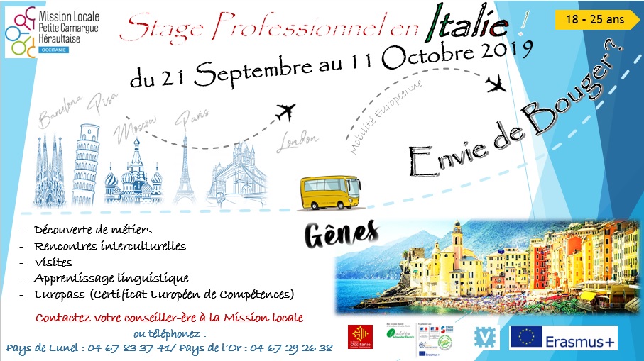 Dans le cadre d’un partenariat avec l’association Viramonde et la Mission Locale Garrigues & Cévennes, la Région Occitanie et le programme européen ERASMUS + , on vous propose de partir 21 jours, tous frais payés, à Gênes, ville située en Italie (à environ 6 heures de route de Montpellier).
